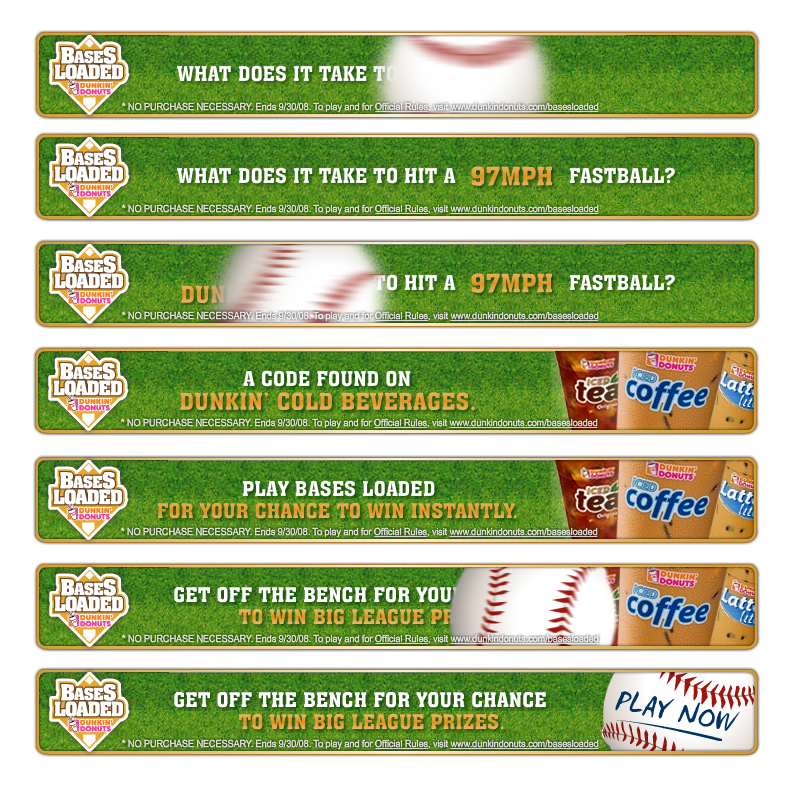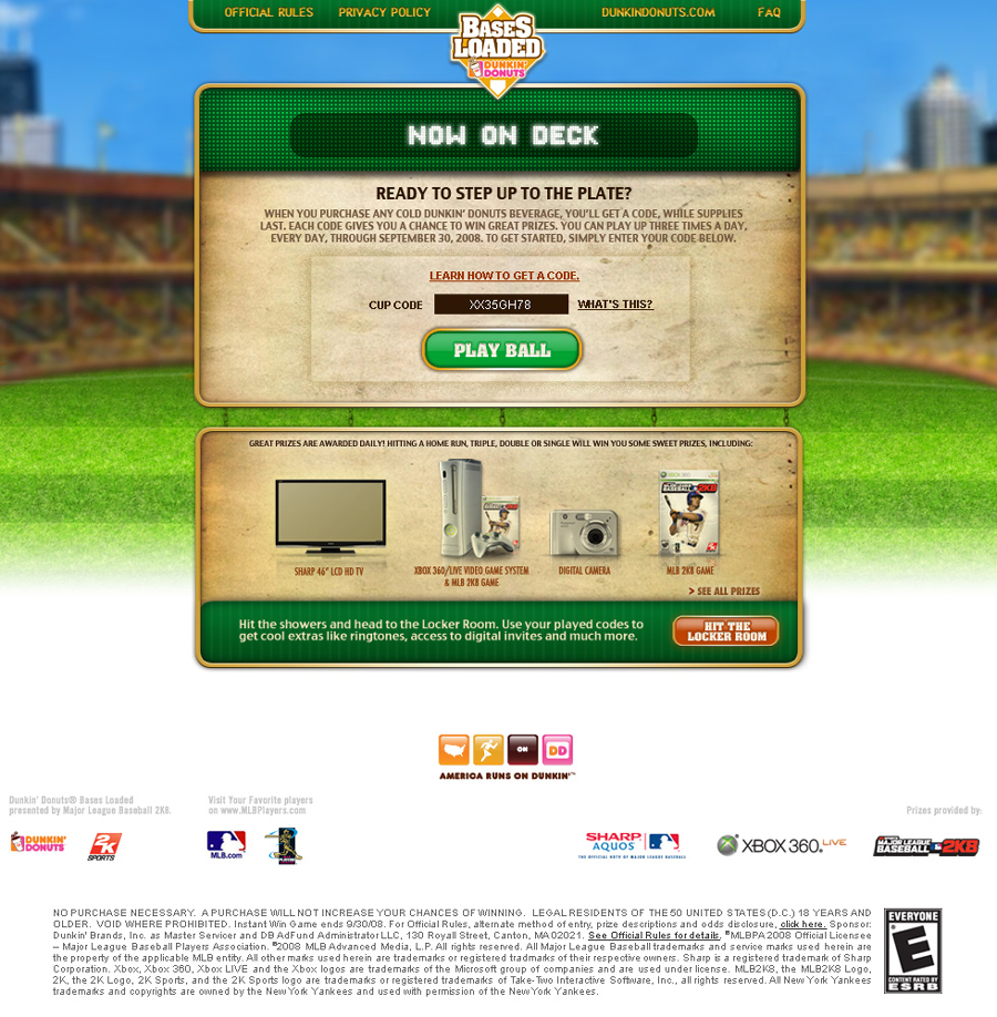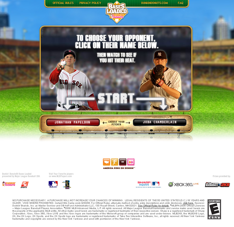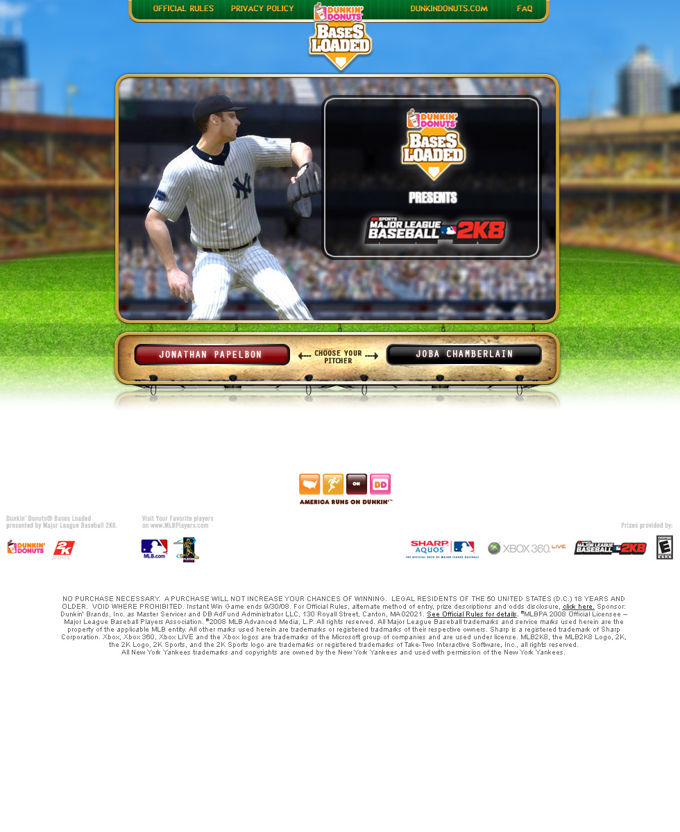 Dunkin' Donuts had a partnership with 2K8 MLB and wanted to launch a campaign that tied into the release of their "Bases Loaded" game. A summer promotion based on codes on cold cups in-store, it leveraged America's favorite sport, and two of the top pitchers in 2008--Jonathon Papelbon of the Boston Red Sox and Joba Chamberlain of the NY Yankees.
