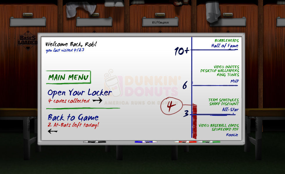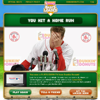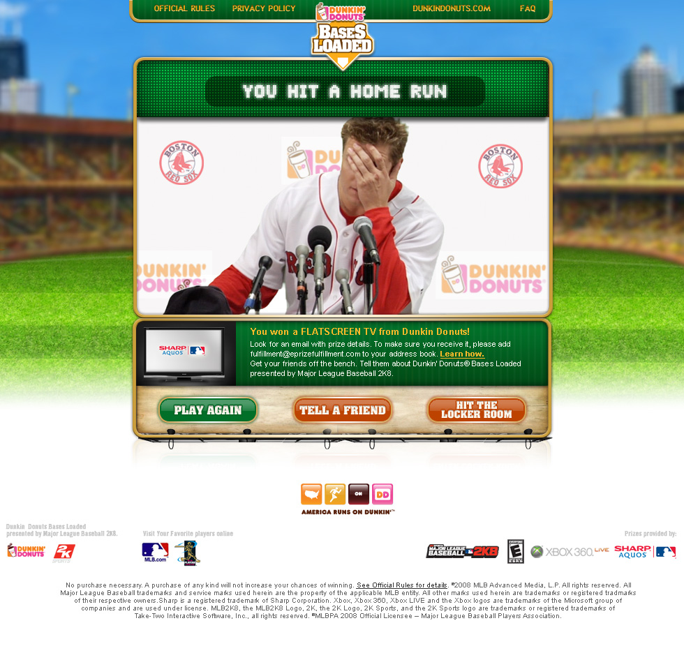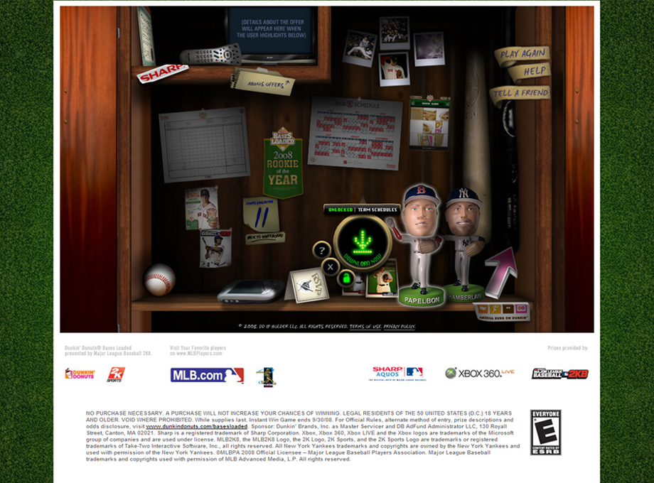 Customers would purchase a cold cup with a code which they would take to the Bases Loaded microsite we created. From there, they participated in an instant win game where they could select the pitcher they wanted to play against (Papelbon or Chamberain), which provided a good low-level engagement. Our challenge was to give people a reason to return, and plus up the overall experience. We incorporated video throughout with customized messages based on play. Additionally, we came up with the idea of a viritual locker room that provided engagements beyond the instant win and encouraged repeat plays for virtual awards and prizing which included Video baseball cards of the Joba and Papelbon giving pointers on pitching, puzzles, Dunkin' Donuts mouse cursors, virtual bobbleheads of Pap and Joba, wallpapers, and more. From scripts to full experience concepts, it was a goal to bring out the personalities of our stars as well as get fans access to exciting and exclusive content.