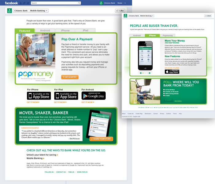 Citizens BankMaking banking more social.As social media AOR for Citizens Bank, VML (previously Studiocom) was tasked with providing strategy and creative for the brand. In a vertical where customer trust is low, our goal was to use social media as a catalyst to build trust using Facebook and Twitter. As creative lead on this account, I worked closely with our clients and cross-discipline teams within the agency. Social Content Strategy: For Facebook and Twitter we put together a plan for content that the brand could push out which would be interesting and relevant to their audience. This included themes and memes such as Monday Fun Facts, Financial Tip Tuesdays, Throwback Thursdays, Did You Know?, and inspirational quotes. We create a template that was on brand, but allowed for some flexibility based on the content it needed to include. This template also allowed for pre-creation of content tied to the calendar, as well as making it easy to create content on the fly as needed to be timely. TruFit Good Citizen Scholarship: Citizens Bank provides scholarship funds to students who are active participants in their communities. From 2011-2013, we used social media to promote awareness of the scholarhsip, drive applications, and to showcase the winners. I lead designers and art directors as we established slightly different visual designs each year for final phase, which was designed in a way that it was a digital poster on Facebook, but could also be printed and posted throughout the schools of the winners (or tacked up on the fridge in their homes). Skill Sets: